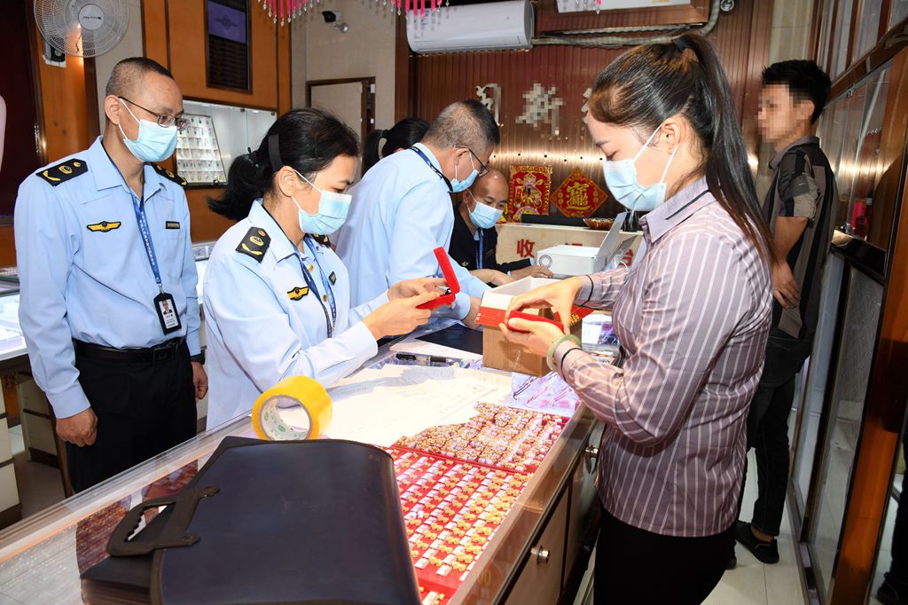 广西来宾市市场监管局执法人员在查办侵犯注册商标专用权商品案。