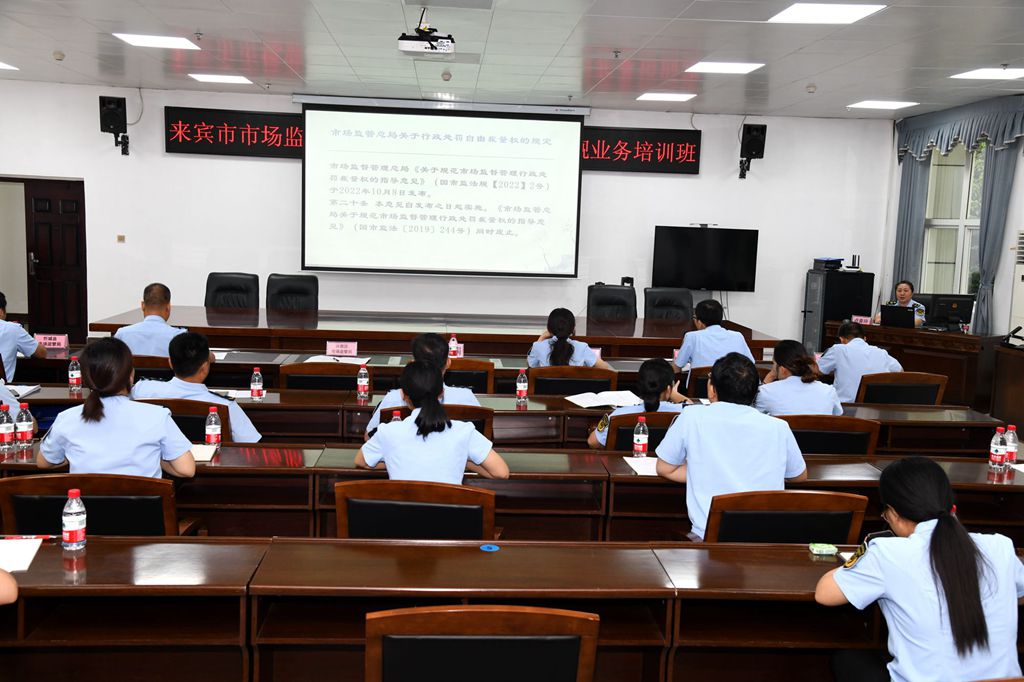 广西来宾市市场监管局开展行政执法大练兵培训活动现场。