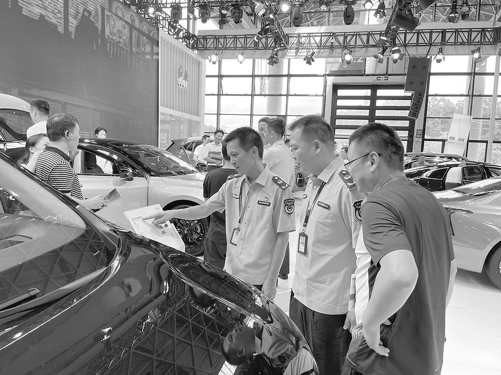 在2023第十二届南宁国际车展期间,广西壮族自治区南宁市市场监管局专业市场分局靠前服务,通过发布经营提示、现场巡查等方式,进一步规范参展企业广告发布行为。图为执法人员在展会现场进行价格监督检查。