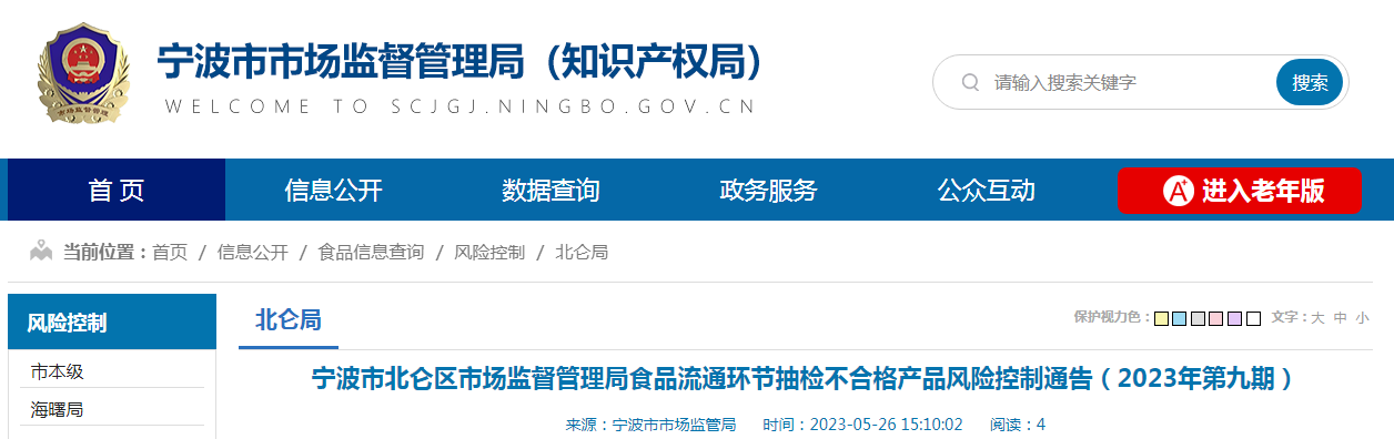 宁波市北仑区市场监督管理局食品流通环节抽检不合格产品风险控制通告(2023年第九期)