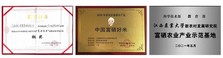 公司已取得ISO9001-2015管理体系认证、天然富硒食品认证、有机食品认证、绿色食品认证,2020年荣获“中国富硒好米”、2021年荣获“全国美味大米”,市农业龙头企业、是科技部、教育部、江西农业大学新农村发展研究院的“富硒农业产业示范基地”,也是国家扶贫产品企业,2022年荣获江西省省级龙头企业,2022年荣获“赣鄱正品”认证品牌。已申请取得3项实用型专利和1项发明专利。